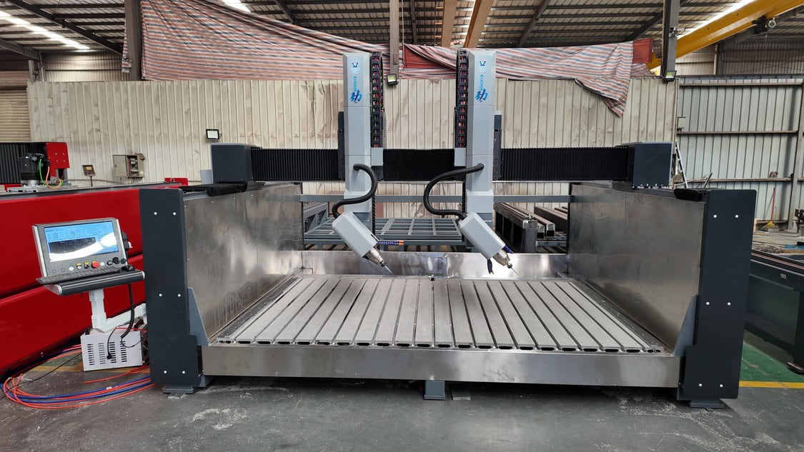 La característica más distintiva de esta máquina son sus dos cabezales de tallado oscilantes con control independiente. Cada cabezal puede girar 180° a lo largo del eje A, lo que permite tallar en múltiples ángulos sin necesidad de reposicionar manualmente la piedra. Esta capacidad permite realizar socavados intrincados, relieves detallados y geometrías complejas que antes eran laboriosas o imposibles con las máquinas tradicionales de 3 ejes.