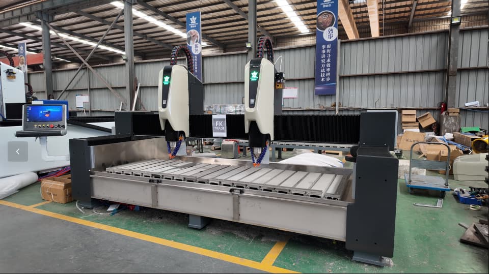 Mientras tanto, los tres ejes máquina de grabado en piedra de doble cabezal Entregada en Taiwán, se centra en la eficiencia de la producción en masa. Con dos cabezales de trabajo independientes que operan simultáneamente, la máquina es ideal para patrones de fondo de pared, lápidas, paneles de piedra y relieves decorativos. En comparación con las máquinas tradicionales de un solo cabezal, esta configuración mejora significativamente la producción por turno, reduce la dependencia de la mano de obra y garantiza una calidad de tallado constante, lo que la convierte en una solución rentable para fábricas que gestionan pedidos personalizados de gran volumen.
