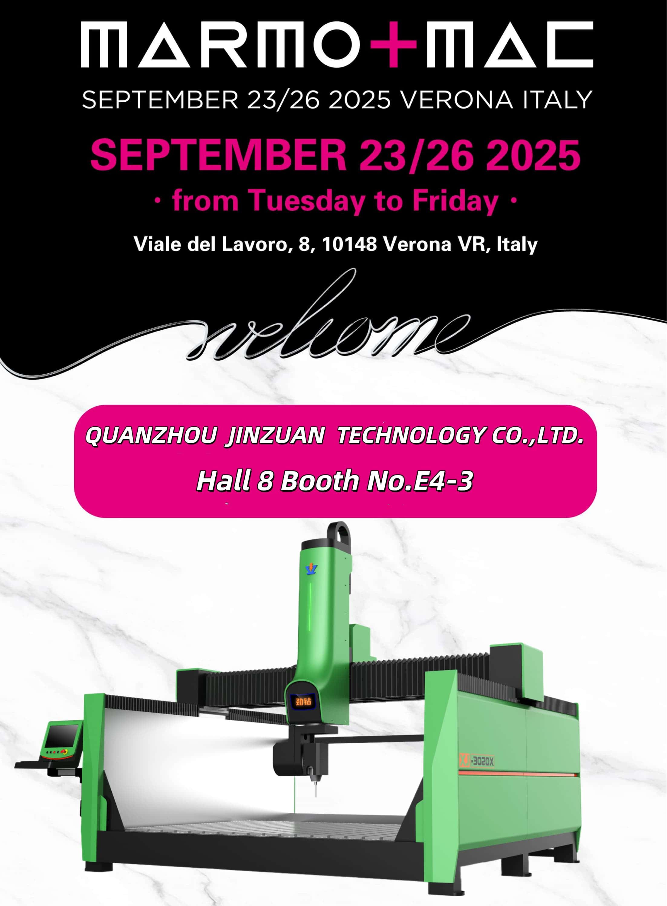 Xiamen Jingzuanyun Machinery Co., Ltd., fabricante líder de maquinaria en China, ha anunciado oficialmente su participación en una exposición internacional que se celebrará en Verona, Italia. Del 23 al 26 de septiembre de 2025La exposición tendrá lugar en Via del Lavoro 8, 10148 VR, VeronaEn el evento, la empresa exhibirá una gama de equipos de vanguardia, y se espera que sus máquinas de grabado de alto rendimiento sean el punto culminante del stand.