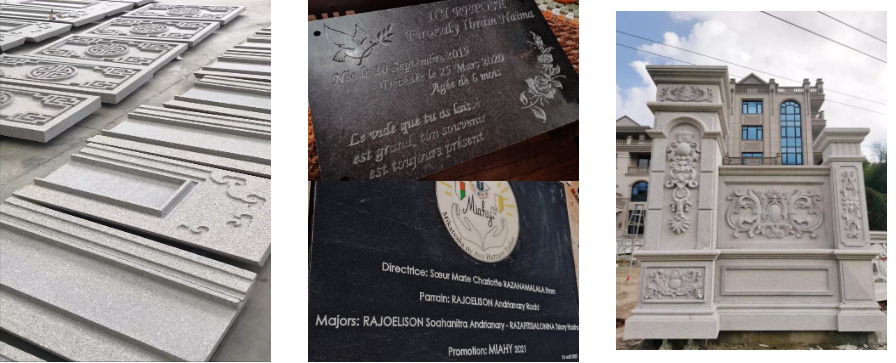 3) Monumentos y lápidas de gran tamaño: Grabado de grandes lápidas de granito con retratos, epitafios y relieves 3D. El giro de 90° permite grabar en la cara y el lateral de la lápida sin necesidad de recargar, lo que reduce el riesgo de rotura de valiosas lápidas.